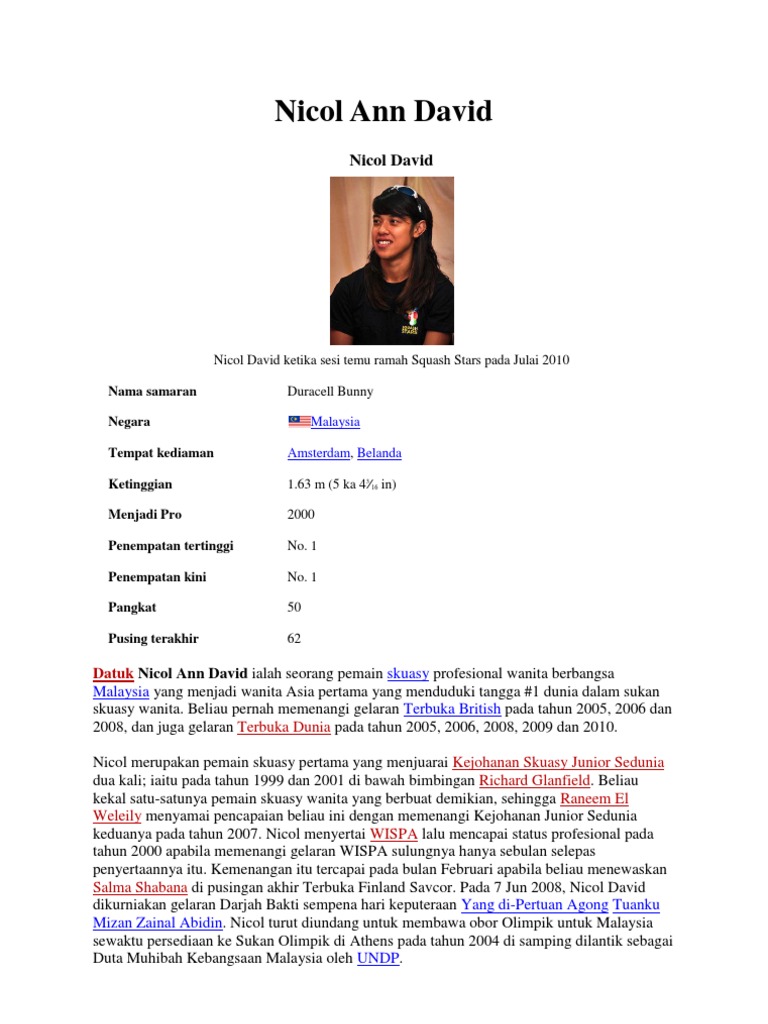 Opinions and recommended stories about nicol ann david full name: Nicol ann david is a malaysian professional squash player who became the first asian to be ranked world number one in women's squash. She won the british open title in 2005, 2006 and 2008, as well as the world open title in 2005, 2006, 2008, 2009 and 2010. Datuk nicol ann david telah dilahirkan pada tanggal 26 ogos 1983 dan lahir di pulau pinang. She has won every major title there is to win.