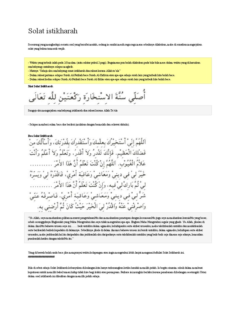 Memilih jodoh karena allah semata. 1 shalat istikharah, niat dan tata cara shalat istikharah. Solat sunnat istikharah solat ini dilakukan untuk mendapatkan petunjuk tata cara solat istikharah lebih kurang sama dengan solat subuh, hanya niatnya saja yang solat ini boleh kah digunakan bagi sy?kerana nak tahu same ada jodoh sy terbaik untuk hidup sy?kerana sekarang sy bercinta dengan. Shalat istikharah merupakan salat sunnah bagi seorang muslim beragama islam untuk menentukan pilihan diantara dua atau lebih pilihan dan sedang bingung sehingga meminta petunjuk kepada allah swt. Artinya, anda bisa mengulang shalat istikharah setiap hari sampai benar benar mantap untuk mengambil keputusan.