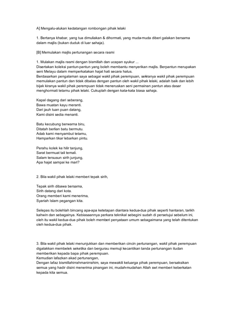 Pantun nusantara majlis pertunangan dan perkahwinan di petik dari setaman pantun kenangan diterbitkan oleh universiti sains malaysia, pulau pinang pada tahun 2006 karya abdul halim r. 3)melakukan pinangan iaitu menyatakn hasrat oleh pihak lelaki dan penerimaan oleh pihak perempuan 4)memberi hadiah atau tanda pertunangan 5)membincangkan perkara2 yang berkaitan dengan akd nikah dan majlis walimatul urus seperti: Di dewan seri melati, presint 3, putrajaya. Berikut merupakan contoh teks ucapan pengacara majlis perkahwinan yang dipetik dari blog anarqiyellow. Majlis perkahwinan mohd firdaus azman & nor khalida makmor.