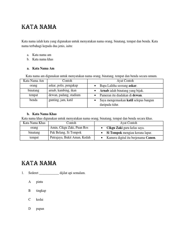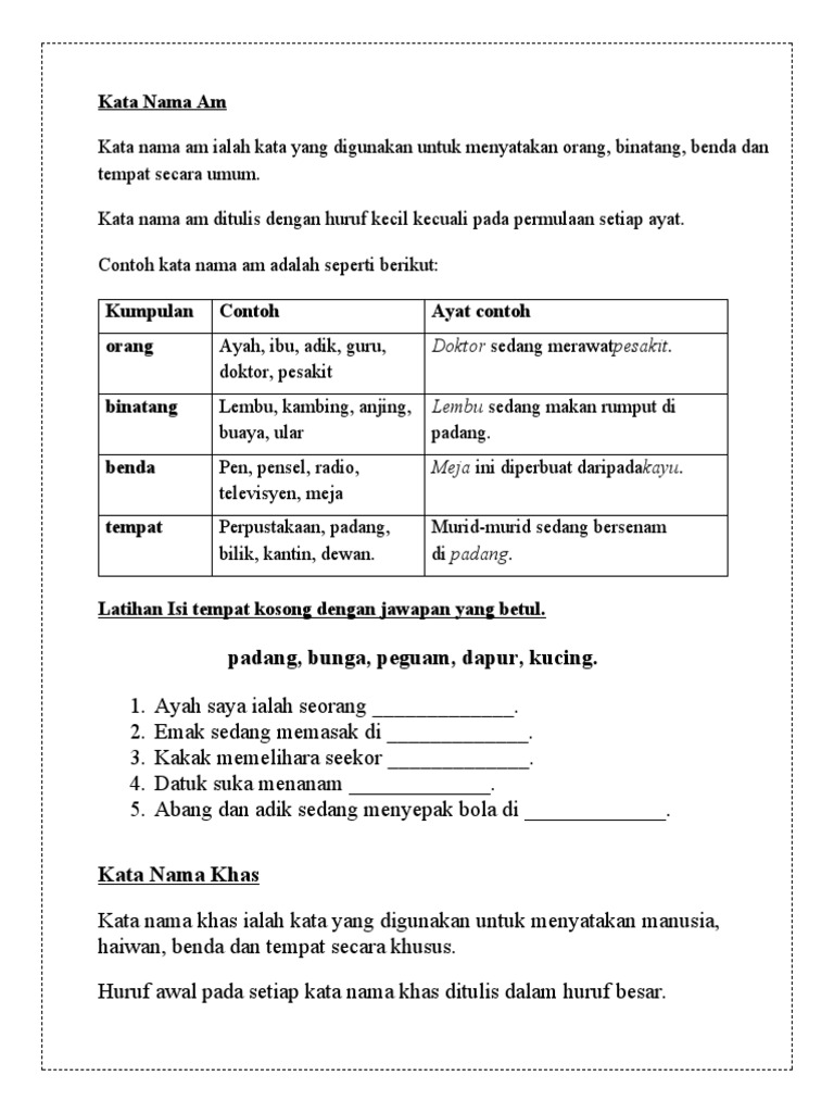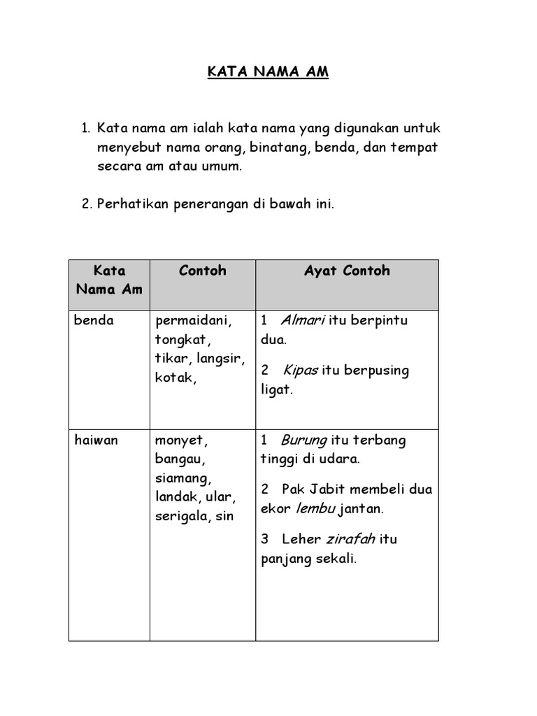 Kata nama terbahagi kepada tiga iaitu kata nama am kata nama khas dan kata ganti nama. Kata nama am hendaklah ditulis dengan menggunakan huruf kecil melainkan pada awal ayat. Nenek mencari kucing nya yang hilang. Kata nama am konkrit dan abstrak boleh terdiri daripada kata asal dan kata nama terbitan. Kata nama contoh ayat contoh khas 1. Ia terbahagi kepada beberapa subgolongan berdasarkan ciri ciri semantik perkataannya iaitu seperti kata nama khas kata nama am dan kata ganti nama. Ayah, ,perempuan kerani, polis, guru, doktor, askar dll. Kata nama am atau kata nama khas benar atau palsu. Kata nama khas (คำนามเฉพาะ) 3. Ia terbahagi kepada beberapa subgolongan berdasarkan ciri ciri semantik perkataannya iaitu seperti kata nama khas kata nama am dan kata ganti nama. Bina ayat contoh ayat kata nama am. Kata nama am ialah kata nama yang digunakan untuk menyebut nama orang, binatang, benda, dan tempat secara am atau umum. For more information and source, see on this link :
